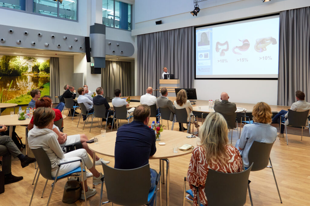 Na een warm welkom door directeur Marketing & Communicatie Hugo van den Berk en voorzitter Dirk Bosman van de Catharina Health Foundation was het tijd voor de boeiende presentatie van oncologisch chirurg prof. dr. Ignace De Hingh. Toen hij in 2003 na een zeer lange studie als chirurg begon, werd hij al snel geconfronteerd met ernstige vormen van darm- en buikvlieskanker waar nog geen enkele behandeling voor was. Dat was onverteerbaar en daarmee begon ook zijn zoektocht naar betere en nieuwe behandelmethoden. “Met één goed onderzoek help je meer patiënten dan een leven lang opereren”, aldus Ignace, die prachtige resultaten liet zien van wat onderzoek allemaal mogelijk kan maken.